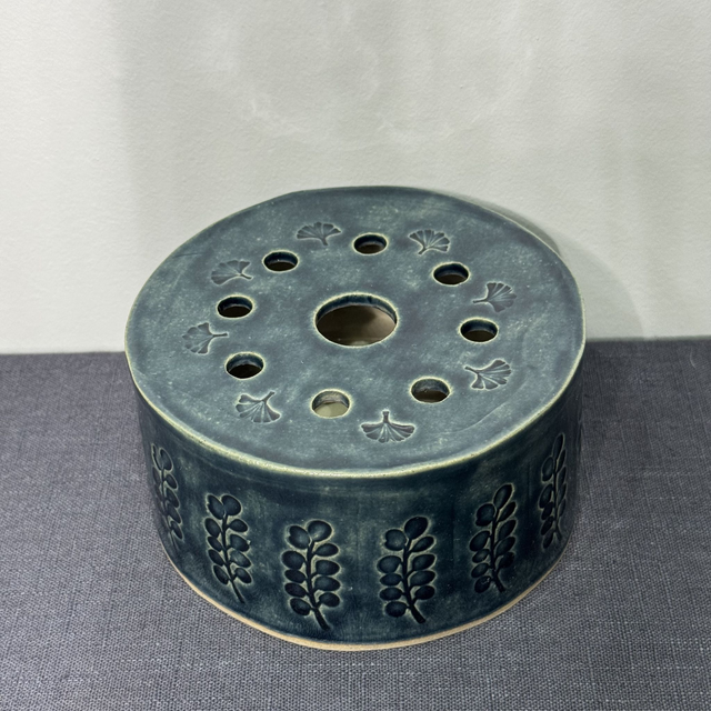 This large circular flower brick has been decorated with a leaf printing block around the outside, and a ginkgo leaf on the top. This is a beautiful glaze which beautifully shows off any shade of foliage or flowers. Approximately 6 cm high, 12 cm diameter.