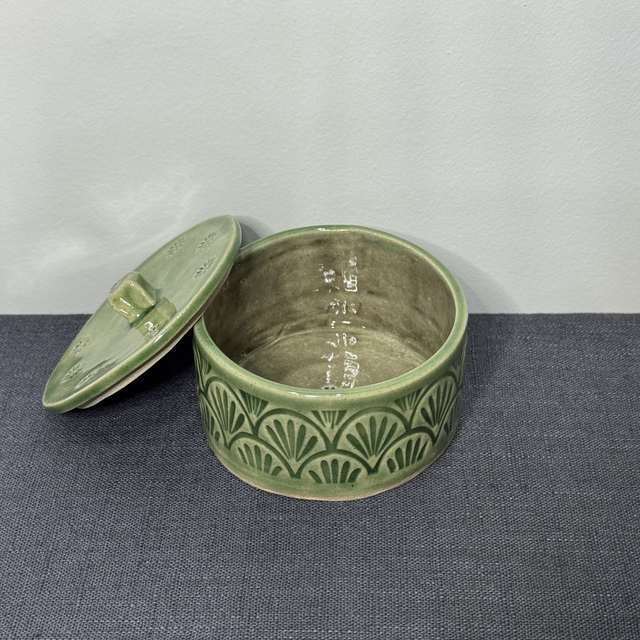 This circular lidded vessel is glazed internally in Smoke, externally in contrasting Jade. Not airtight but food safe.