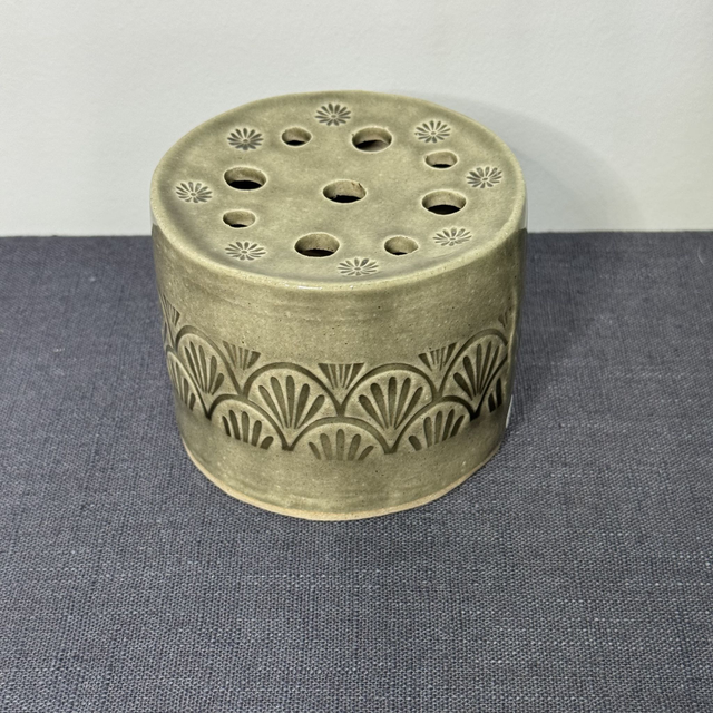 This flower brick is perfect for a collection of single stem flowers, or lots of showy blooms. You really can get a lot of stems in each of the holes. This short version is great for a table centre, because it is not too tall. Approximately 6 cm high, 7.5 cm diameter, with 9 holes.