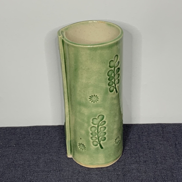 This vase is textured with wooden printing blocks depicting daisies and leaves. It is glazed in jade green. Other colour combinations available on request. Height 12.5cm, diameter 5cm.