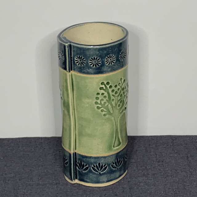 This vase is textured with wooden printing blocks depicting a tree, daisy and flower heads. It is glazed in dark blue and green. Other colour combinations available on request. Height 12.5cm, diameter 5cm.